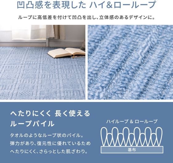 扱いやすい軽量の平織カーペット。一人暮らしでも持ち運び簡単。弾力があり復元性に優れていてへたりにくく、ふかふかとした肌触りが特徴です。