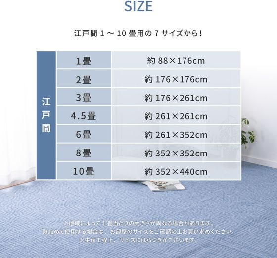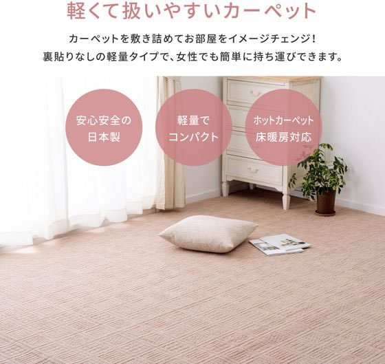 扱いやすい軽量の平織カーペット。一人暮らしでも持ち運び簡単。弾力があり復元性に優れていてへたりにくく、ふかふかとした肌触りが特徴です。