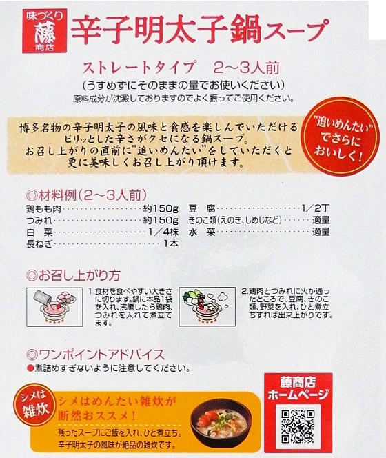 博多名物の辛子明太子のピリッとした辛さと食感を楽しんで頂ける鍋スープ