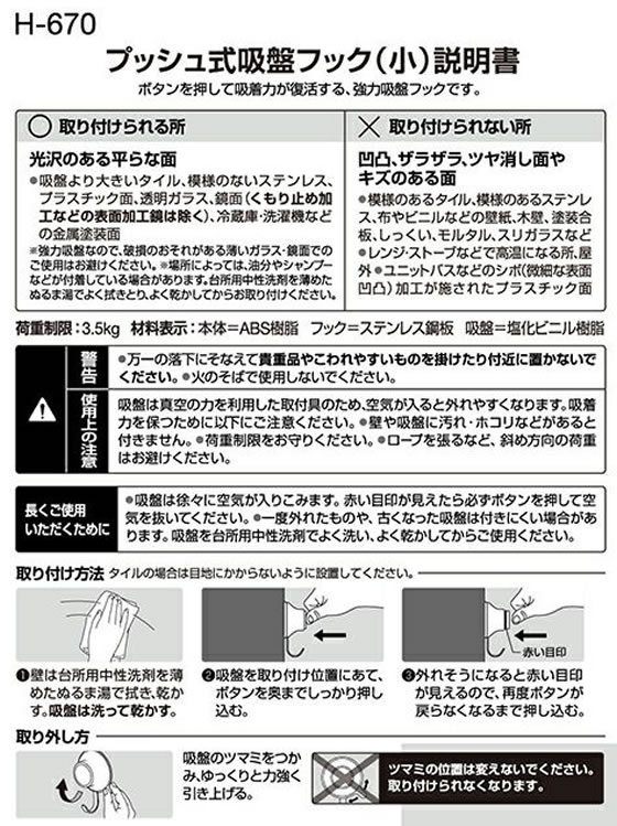 レック プッシュ式吸盤フック(S) 2個入 H-670 フック 掲示物留め 吊下げ POP 掲示