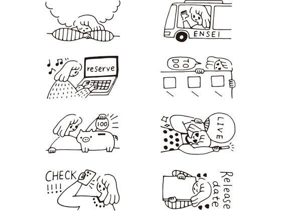 インキパッド付きなのでスタンプ台は不要。これ1台で8つの繊細な柄をきれいにスタンプすることができます。柄の切り替えは、手が汚れる心配がないダイヤル式。インキは油性顔料なので、押した絵柄の上から水性マーカーで色を塗ってもにじみません。約1000回押すことができますが、薄くなったら別売りの「補充インキ」で補充してください。トレンドの「推し活」をテーマに、その一連の行動シーンを柄におこしました。