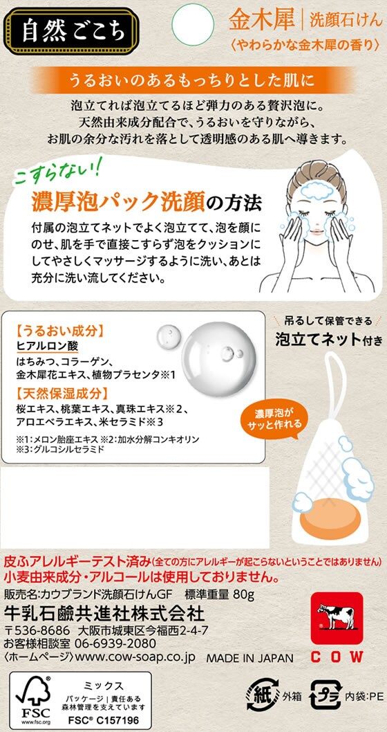牛乳石鹸 自然ごこち 金木犀 洗顔石けん 80g クレンジング 洗顔料 フェイスケア スキンケア