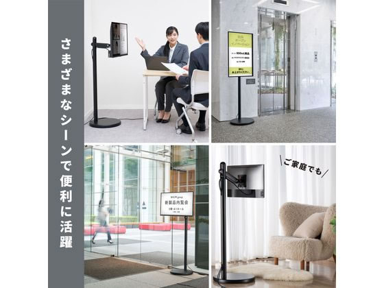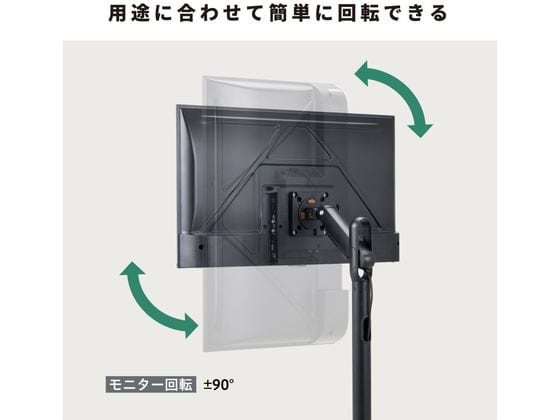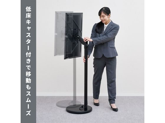 アーム付きで、高さ・角度を自由自在に調整できるモニタースタンドです。モニターの画面をタテ・ヨコ90度に回転可能で、用途に合わせてさまざまなシーンで活用できます。さらに低床キャスターが付いているため、好きな場所へスムーズに安定して移動することができます。