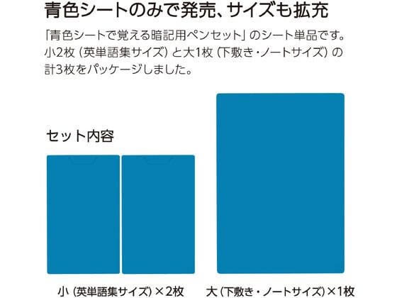 青色シートで覚える暗記用ペンセットのシート単品です。青色には集中実感効果があることが報告されており、暗記をサポートします。シート小(英単語集サイズ)2枚と、ノート1ページ分を丸ごと隠せるシート大(下敷き・ノートサイズ)1枚の計3枚入りなので、複数の参考書で使用したり、学習の仕方に応じて使い分けたりすることができます。