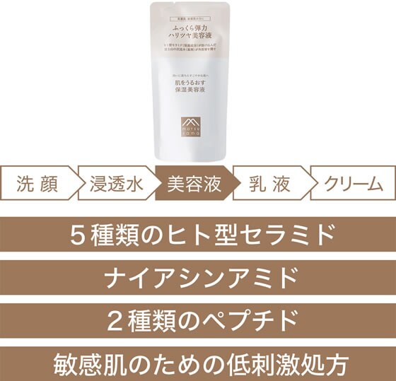 シリーズ共通成分であるセラミド・大豆由来成分に加え、ハリ効果のある複合ペプチドを配合した美容液の、ゴミ削減に貢献する詰替用パウチ。