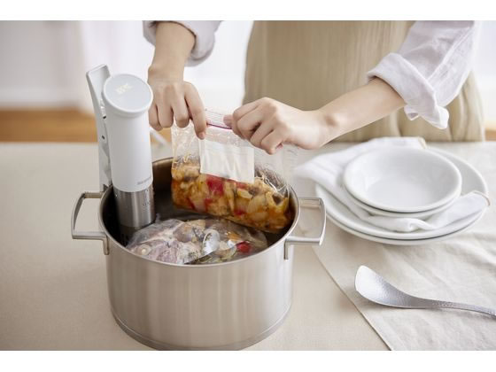 様々な鍋に対応できます。3ステップでかんたん調理!STEP1.なべを用意し、水を入れる。調理器をセットし、予熱開始。STEP2.食材と調味料をチャック付きの密封袋に入れ、空気を抜いてチャックを閉じる。STEP3.設定温度に達したら食材を入れた袋を沈める。音が鳴ったらできあがり。25~95℃の温度設定で幅広いメニューを楽しめます。肉・魚だけでなく、野菜・果物・スイーツなどの調理も可能です丸洗いできてお手入れが簡単です。