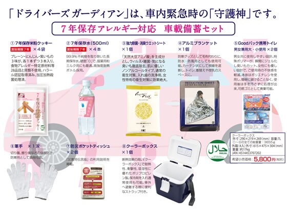 災害や大渋滞等、車内で長時間過ごさなければならない、もしもの時の車内トランク備蓄用保存食セット。7年保存水と長期保存クッキーは、車載備蓄品として、-20℃から80℃までの過酷な車内の保存条件に対応可能。耐久・耐熱検査(サイクルテスト)、食品衛生法の登録検査機関での長期保存の品質確認試験適合。食物アレルギー特定原材料等28品目及び貝類不使用。ハラール認証取得。コンパクトに7Lクーラーボックスで収納。