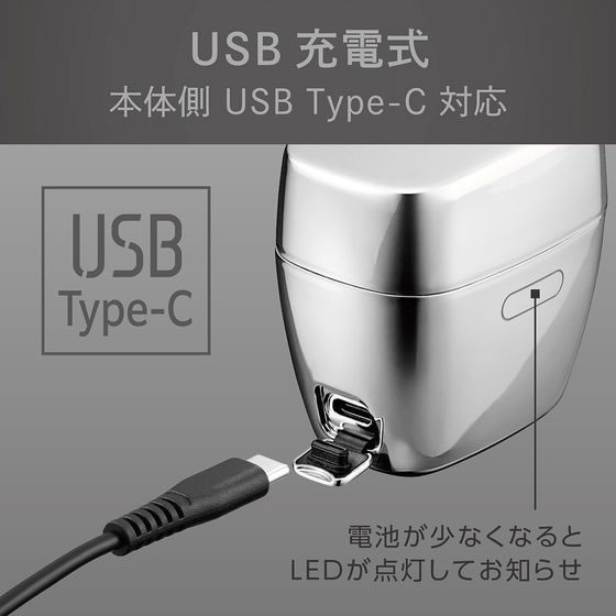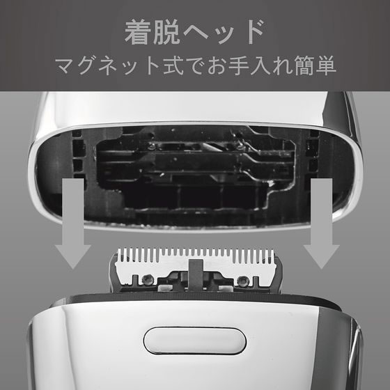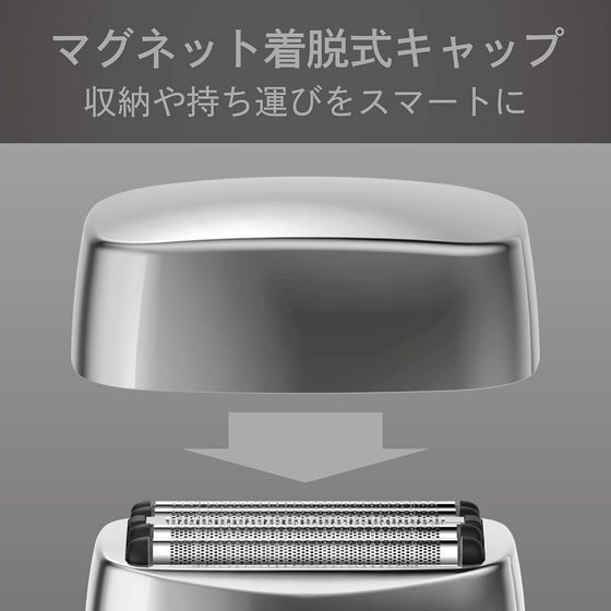 IPX7基準の防水設計、お風呂で使用OK。USB充電タイプ(充電中に使用OK)。往復式5枚刃、肌に密着するフロート構造。誤動作防止、持ち運びの際に電源ボタン長押しでロックできる機能搭載。電池残量が少なくなるとLEDランプが点灯するお知らせ機能搭載。マグネット式でお手入れ簡単な着脱ヘッド、携帯や収納に便利な専用キャップとケース付き