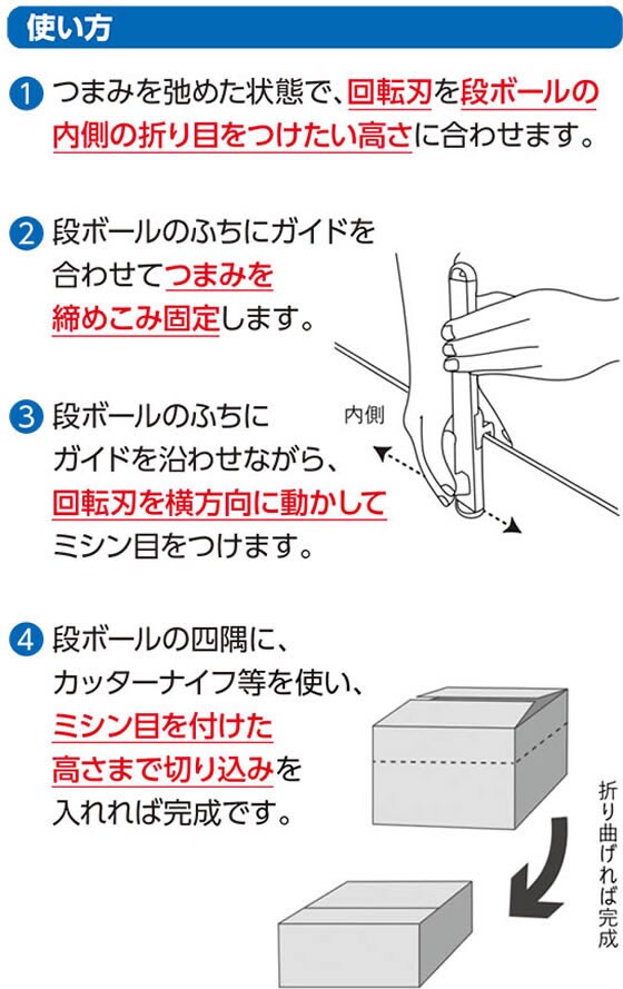 ●使い方:【1】つまみをゆるめた状態で、回転刃を段ボールの内側の折り目をつけたい高さに合わせます【2】段ボールのふちにガイドを合わせてつまみを締めこみ固定します【3】段ボールのふちにガイドを沿わせながら回転刃を横方向に動かしてミシン目をつけます【4】段ボールの4隅に、カッターナイフ等を使い、ミシン目を付けた高さまで切り込みを入れれば完成です