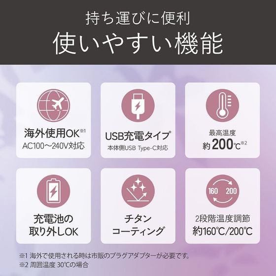 コードレスタイプのストレートアイロン、チタンコーティング採用。海外使用OK、充電池取り外しOK。専用USB-ACアダプター、USBケーブル付属。本体側USB Type-C対応。2段階式で誤作動を防ぐ安全スイッチ、プレートロック機構、ポーチ付き。立ち上がりスピード約30%UP(最高温度設定時100℃到達時間、従来品KHR8640との比較)