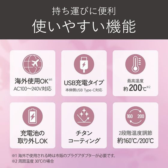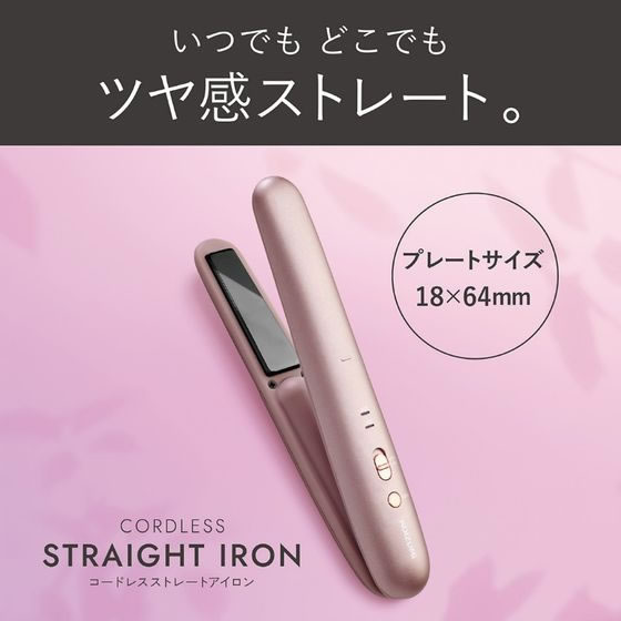 コードレスタイプのストレートアイロン、チタンコーティング採用。海外使用OK、充電池取り外しOK。専用USB-ACアダプター、USBケーブル付属。本体側USB Type-C対応。2段階式で誤作動を防ぐ安全スイッチ、プレートロック機構、ポーチ付き。立ち上がりスピード約30%UP(最高温度設定時100℃到達時間、従来品KHR8640との比較)