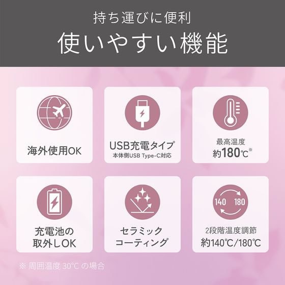 ※特許第7624548。充電池の取り外しOK、海外使用OK、2段階温度調整(約140℃/180℃)。手のひらサイズ&キャップ付きで持ち運びに便利。2段階式で誤作動を防ぐ安全スイッチ。専用USBケーブル付(本体側USB Type-C対応)