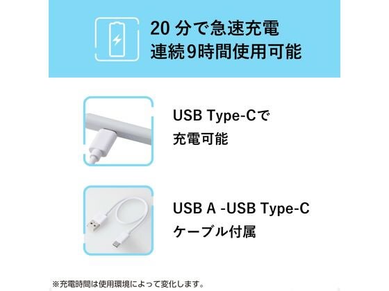 約20分でフル充電可能な急速充電機能を搭載。電池が切れても充電してからすぐに使用できます。