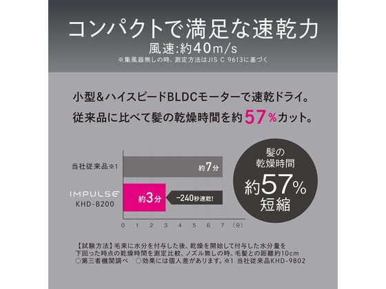 コンパクトで満足な速乾力。4つの風を選べる軽量ドライヤー。約10万回転/分のBLDCモーター搭載。パワフルな風を届けます