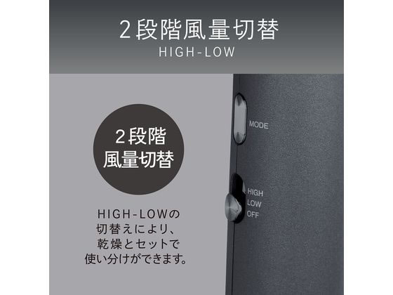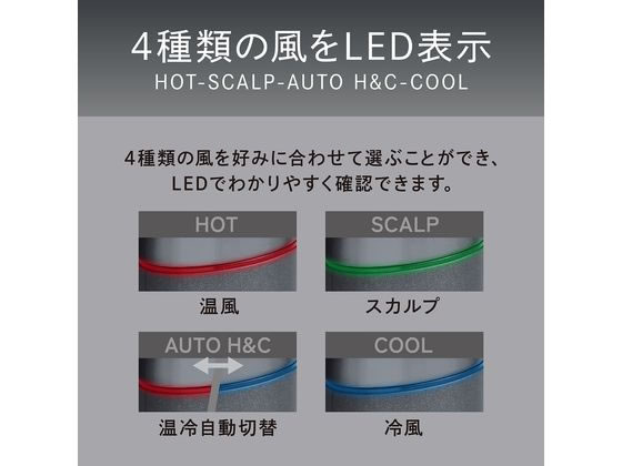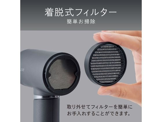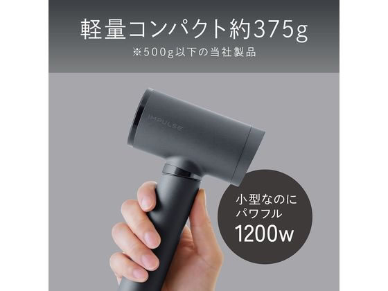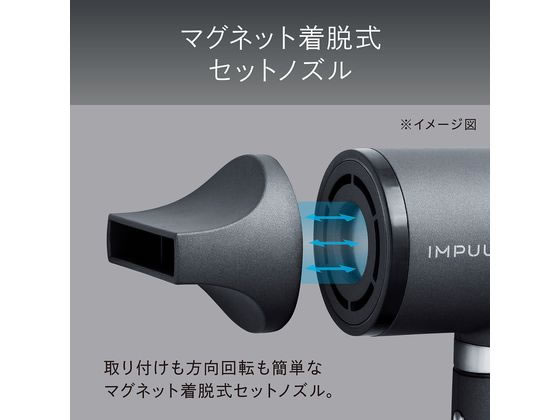 ※Highモードの時。ハイパワー1200W、マイナスイオン搭載。4種類の風(HOT-SCALP-AUTO H/C-COOL)、2段階風量調節(HIGH-LOW)。軽量・コンパクト375g。取り付けも回転も簡単なマグネット式セットノズル、着脱式フィルター。