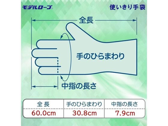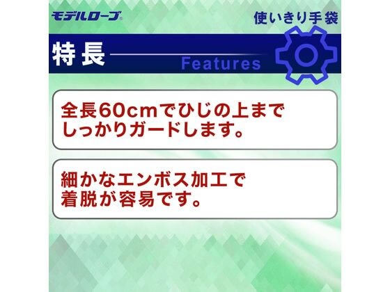 内側表面の細かいエンボス加工で着脱が容易です。左右両用タイプ。ひじの上までしっかりカバーするロングタイプ。食品加工、薬品取扱などに使用できます。食品衛生法適合。バイオ産業や食品加工、薬品取扱に適しています。