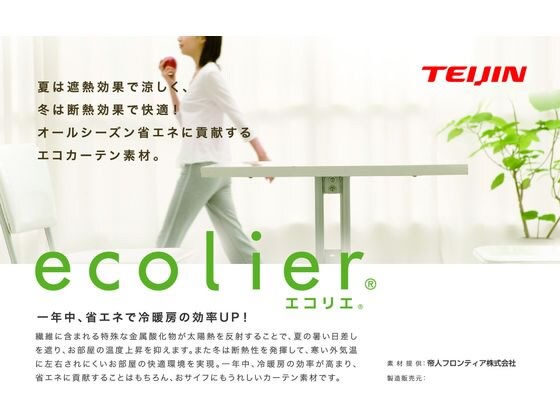 ecolier(R)(エコリエ)とは/エコリエ(R)は、特殊な金属酸化物が含まれた繊維です。このエコリエ(R)の金属酸化物が太陽熱を反射することで夏の暑い日差しを遮りお部屋の温度上昇を抑えます。冬は断熱性を発揮して、寒い外気温に左右されにくいお部屋の快適環境をサポートします。一年中冷暖房の効率が高まり、省エネでおサイフにもうれしいカーテン素材です。