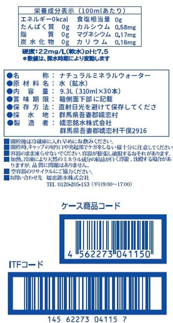 送料無料 嬬恋銘水 嬬恋の天然水 ラベルレス 310mL×30本 ミネラルウォーター 軟水 水 飲料
