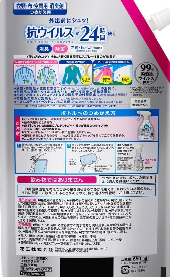 KAO リセッシュ除菌EX プロテクトガード 詰替 スパウトパウチ 660mL スプレータイプ 消臭 芳香剤 室内用 清掃