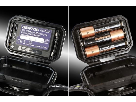 専用充電池と乾電池兼用可能なフロントバッテリーハイブリッド充電式ヘッドライト。