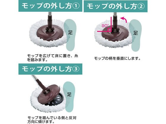 モップを上下に動かすだけでモップが回転、洗浄・脱水もモップを引き上げるだけで簡単に切り替えできます。