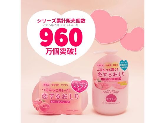 「恋するおしり」ヒップケアソープに、キュートなボディローションが仲間入り。スクラブソープで洗った後のつるんとしたおしりが長続き。9種の植物由来成分に加えて、モモセラミド(フィトステリルグルコシド/グルコシルセラミド)・パルミチン酸レチノール・ナイアシンアミドといった人気の潤い成分を配合。