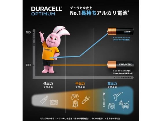 ※デュラセル単4アルカリ乾電池(日本市場販売品)、IEC2021基準、エネルギー平均比