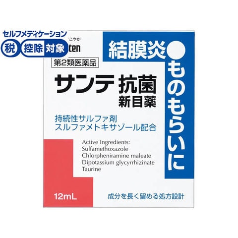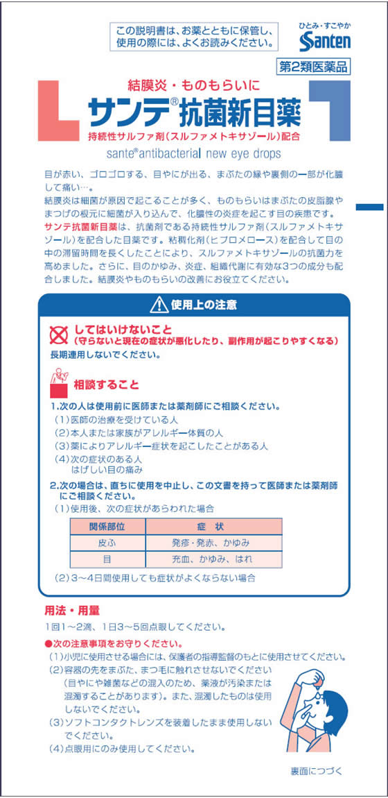 サンテ抗菌新目薬は、抗菌剤である持続性サルファ剤(スルファメトキサゾール)を配合した目薬です。粘稠化剤(ヒプロメロース)を配合して目の中の滞留時間を長くしたことにより、スルファメトキサゾールの抗菌力を高めました。さらに、目のかゆみ、炎症、組織代謝に有効な3つの成分も配合しました。