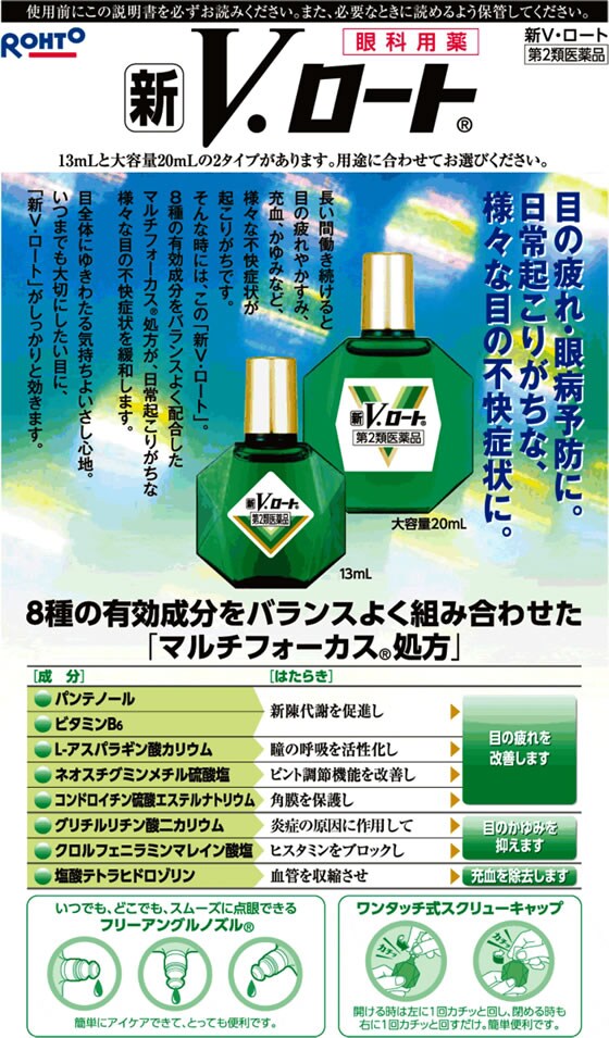 そんな時には、この「新V・ロート」。8種の有効成分をバランスよく配合したマルチフォーカス処方が、日常起こりがちな様々な目の不快症状を緩和します。