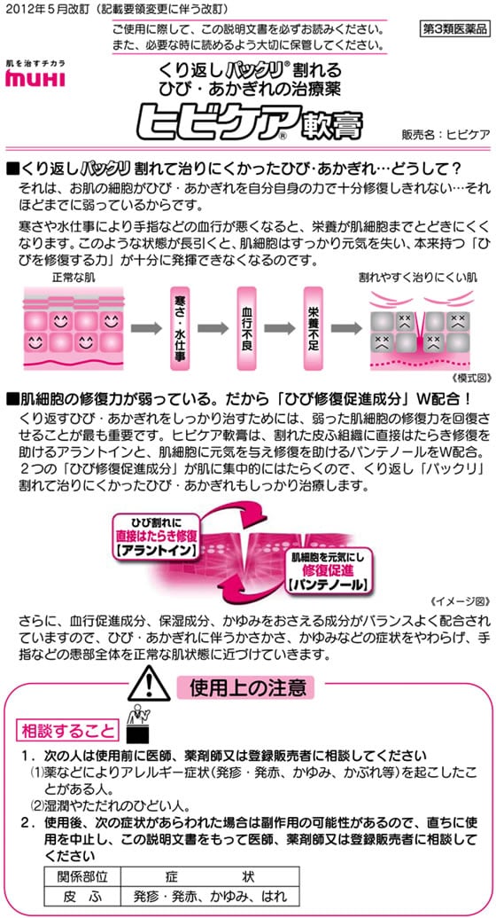 ■肌細胞の修復力が弱っている。だから「ひび修復促進成分」W配合!くり返すひび・あかぎれをしっかり治すためには、弱った肌細胞の修復力を回復させることが最も重要です。ヒビケア軟膏は、割れた皮ふ組織に直接はたらき修復を助けるアラントインと、肌細胞に元気を与え修復を助けるパンテノールをW配合。2つの「ひび修復促進成分」が肌に集中的にはたらくので、くり返し「パックリ」割れて治りにくかったひび・あかぎれもしっかり治療します。
