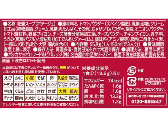 ●原材料:トマトパウダー(スペイン製造)、乳糖、砂糖、クリーム加工品(植物油脂、クリーム、乳糖、乳たんぱく、その他)、じゃがいもパウダー、食塩、オニオンパウダー、トマト調味料、野菜ブイヨン、チーズ酵素分解物加工品、チーズパウダー、チキンブイヨン、香辛料、うきみ(乾燥バジル)/増粘剤(加工でん粉、グァーガム)、調味料(アミノ酸等)、微粒二酸化ケイ素、(一部に小麦・乳成分・大豆・鶏肉を含む)