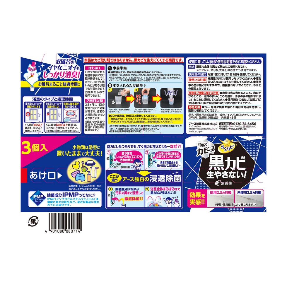 アース製薬 らくハピ オフロカビーヌ防カビくん煙剤 ヨクシツ用ムコウ3個 浴室用洗剤 掃除用洗剤 洗剤 清掃