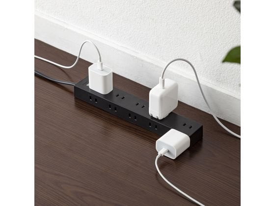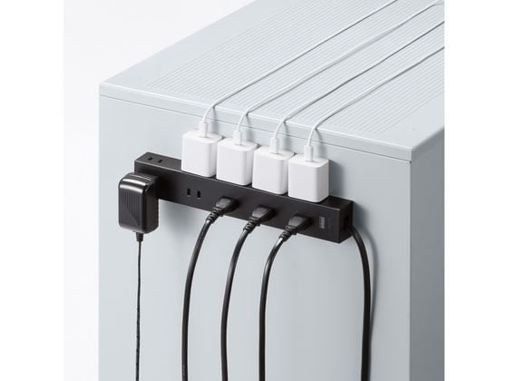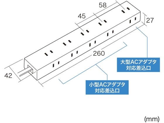 差込口は45mmピッチで小型ACアダプタが10個接続可能です。iPadなどのタブレットの充電器接続に便利です。1箇所はピッチが58mmと広く、大型のACアダプタが設置可能です。マグネット付きなので、スチールキャビネット・デスクに取り付けできます。ホコリ防止シャッター付きで、ホコリの侵入を防止します。壁などに仮固定できるフック穴付きです。