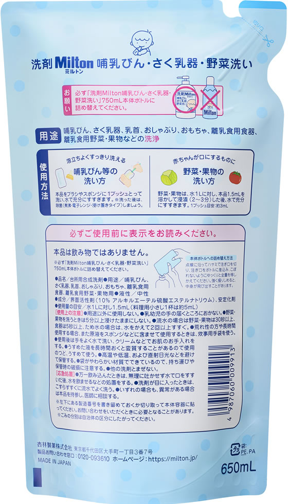 杏林製薬 洗剤ミルトン 哺乳瓶・搾乳器・野菜洗い 詰替650mL ヘルスケア ベビーケア