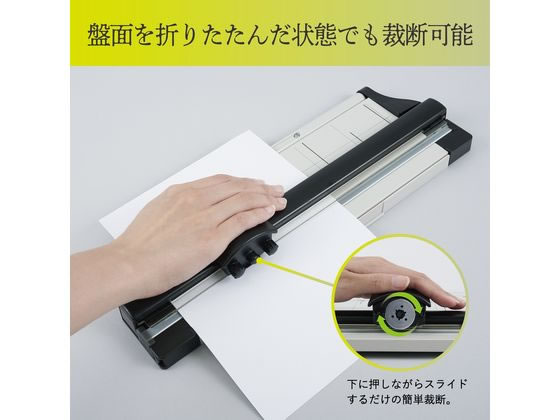 スライダーを下に押しながら滑らすだけのスライド式裁断機です。上から刃を下ろす押し切りタイプの断裁機とは異なり、刃を回転させながら裁断する仕様なので、少しの力で正確に、そして綺麗に裁断可能です。180度折りたためる板面は収容面積を約50%削減でき、引き出しやキャビネットなどに保管できます(弊社DC-200Nと比較)。刃やカッターマットは交換することで、良好なコンディションでご使用いただけます。