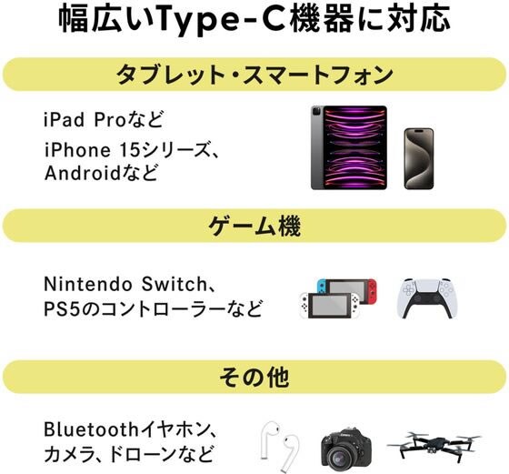 最大15W(5V/3A)で接続機器の充電が可能です。