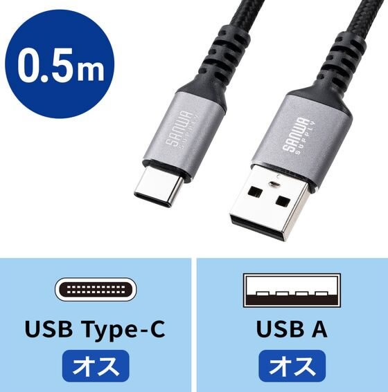 USBポート(USB2.0 Aコネクタメス)を持つパソコンや充電器やモバイルバッテリー等の機器と、USB Type-Cポートを持つ周辺機器を接続する時に使用するケーブルです。