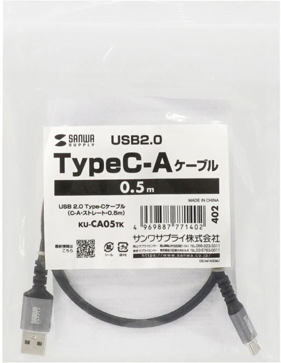 【お取り寄せ】 サンワサプライ USB2.0 Type-Cケーブル C-A・0.5m KU-CA05TK USBケーブル C to A ケーブル 電源タップ 配線パーツ 家電