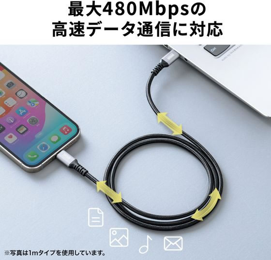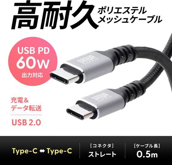 外皮にポリエステルメッシュを採用しており、高密度編組で覆われて強度と靭性が高く断線しにくいケーブルです。