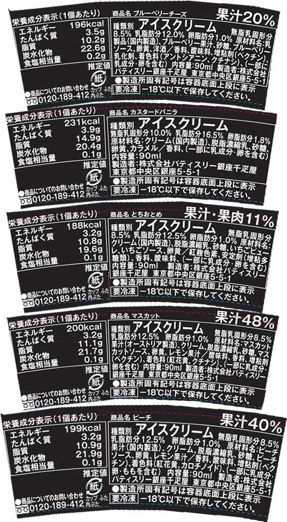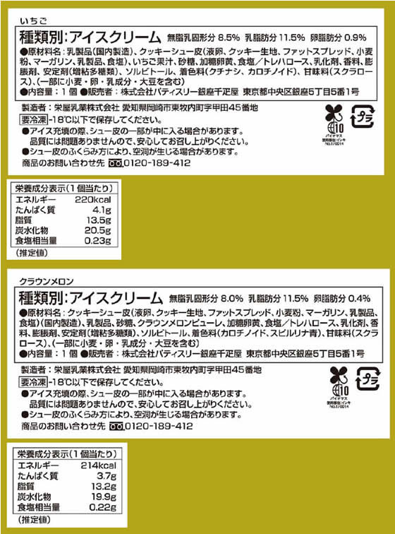 ●内容量:プレミアムアイス(カスタードバニラ・とちおとめ・マスカット・ピーチ・ブルーベリーチーズ 90ml×各1個)、プレミアムシューアイス(いちご・クラウンメロン・マンゴー・カスタードバニラ×各1個)