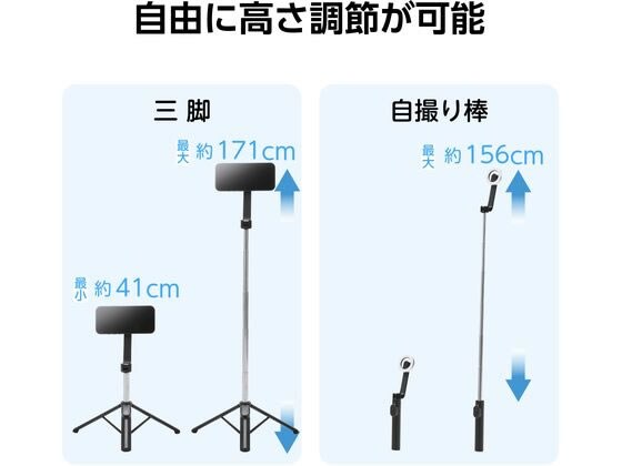 自撮り棒としても使える2Way設計。最大約1710mmまで伸びるロングタイプ三脚。
