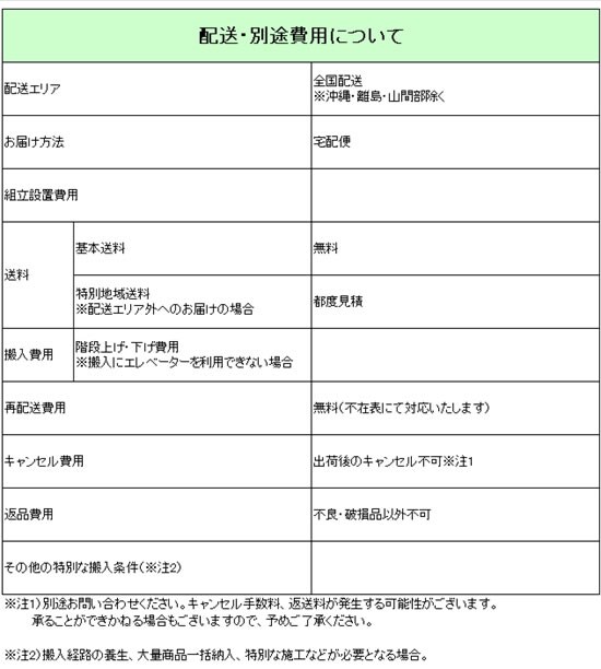 沖縄・離島・一部北海道や山間部へのお届けの場合、別途送料の発生、もしくはお届けができない場合がございます。