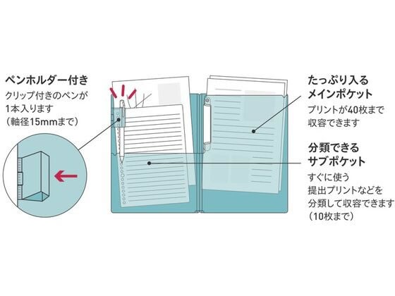 プリントを分類できる2つのポケットと、書き込みしたいプリントをとじておけるクリップによって、プリントへの書き込みと保管が1冊でできる。