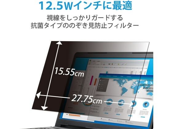 移動中やオフィスでの周りからの視線をしっかりガード!タッチパネルにも対応した、抗菌タイプののぞき見防止フィルターです。