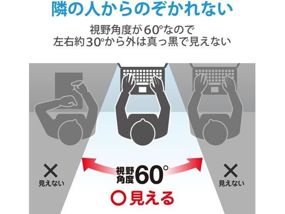 画面の正面を中心に60度(左右30度)より外の角度からは画面がまっ黒に見えるので、パソコン画面を見られる心配がありません。
