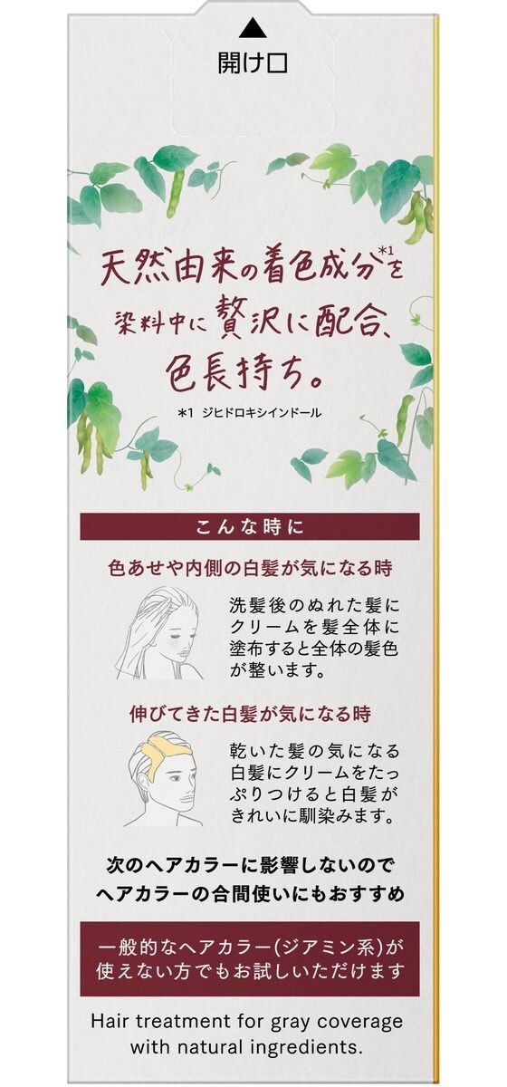 天然由来の着色成分(ジヒドロキシインドール)を染料中に贅沢に配合。放置時間たった5分。シャンプーでも色落ちしにくく、週1回の使用で、きれいな髪色が続く。