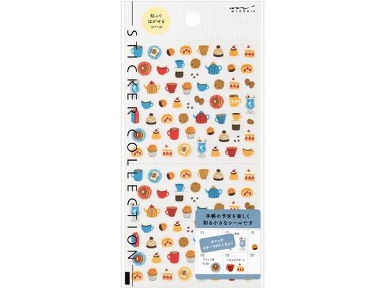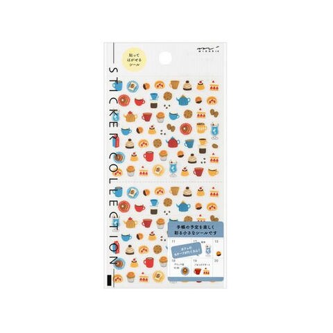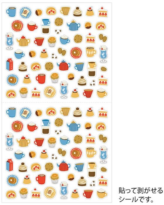 かわいいモチーフの小粒タイプのシールがたっぷり入っています。「カフェ柄」は、カフェラテや紅茶、パンケーキや焼き菓子など、カフェのメニューにありそうなおいしい物を集めた、ほっと一息つきたいときにぴったりなデザインです。
