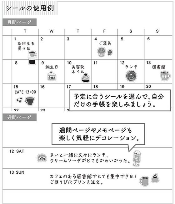 手帳の日付や見出し部分を強調したり、罫線や余白に彩りを添えて楽しく飾る、貼って剥がせるシールです。