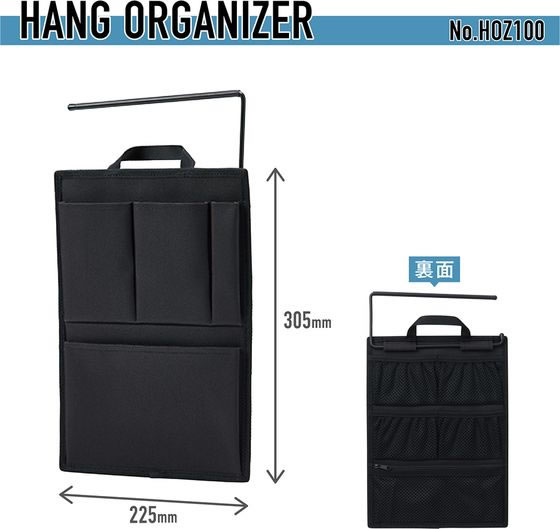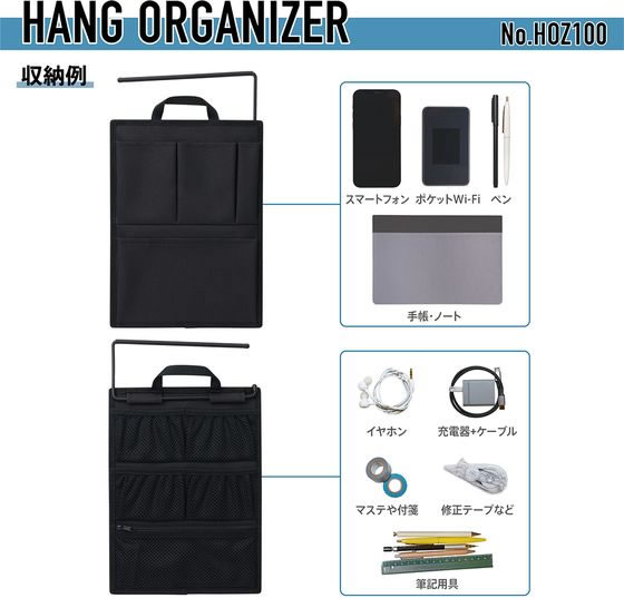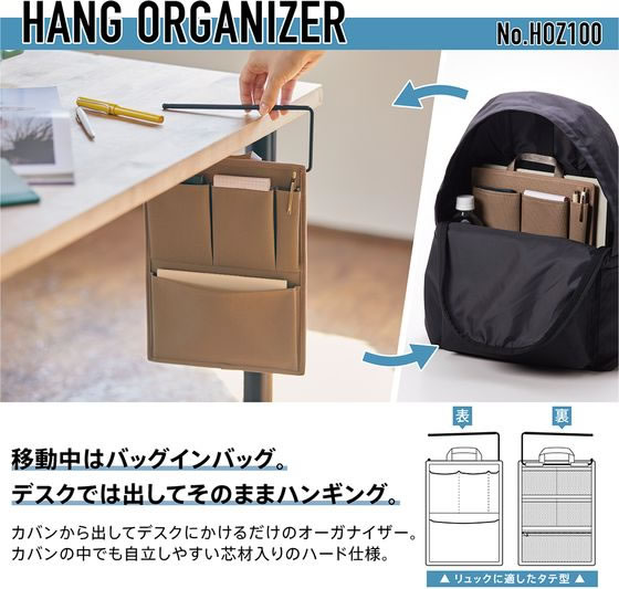 デスクに引っ掛けて使えるハングオーガナイザー。散らかりがちな文房具やPC周辺用品もデスク下のデッドスペースを有効活用して収納可能。フックを折りたたむとA4サイズになり持ち運びにも便利。自立しやすい芯材入りで/移動中はバッグインバッグに。使用時はカバンから出してデスクにかけるだけでスムーズに仕事環境が整う。裏面のメッシュポケットは上段がゴムバンド/下段がファスナーで/小物がこぼれ落ちにくい。
