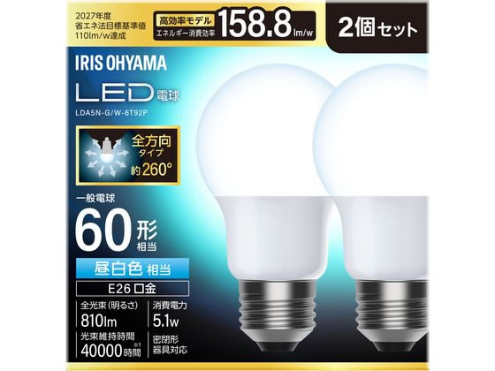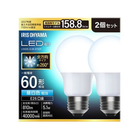 アイリスオーヤマ LED電球 E26 60形昼白色*2 LDA5N-G/W-6T92P